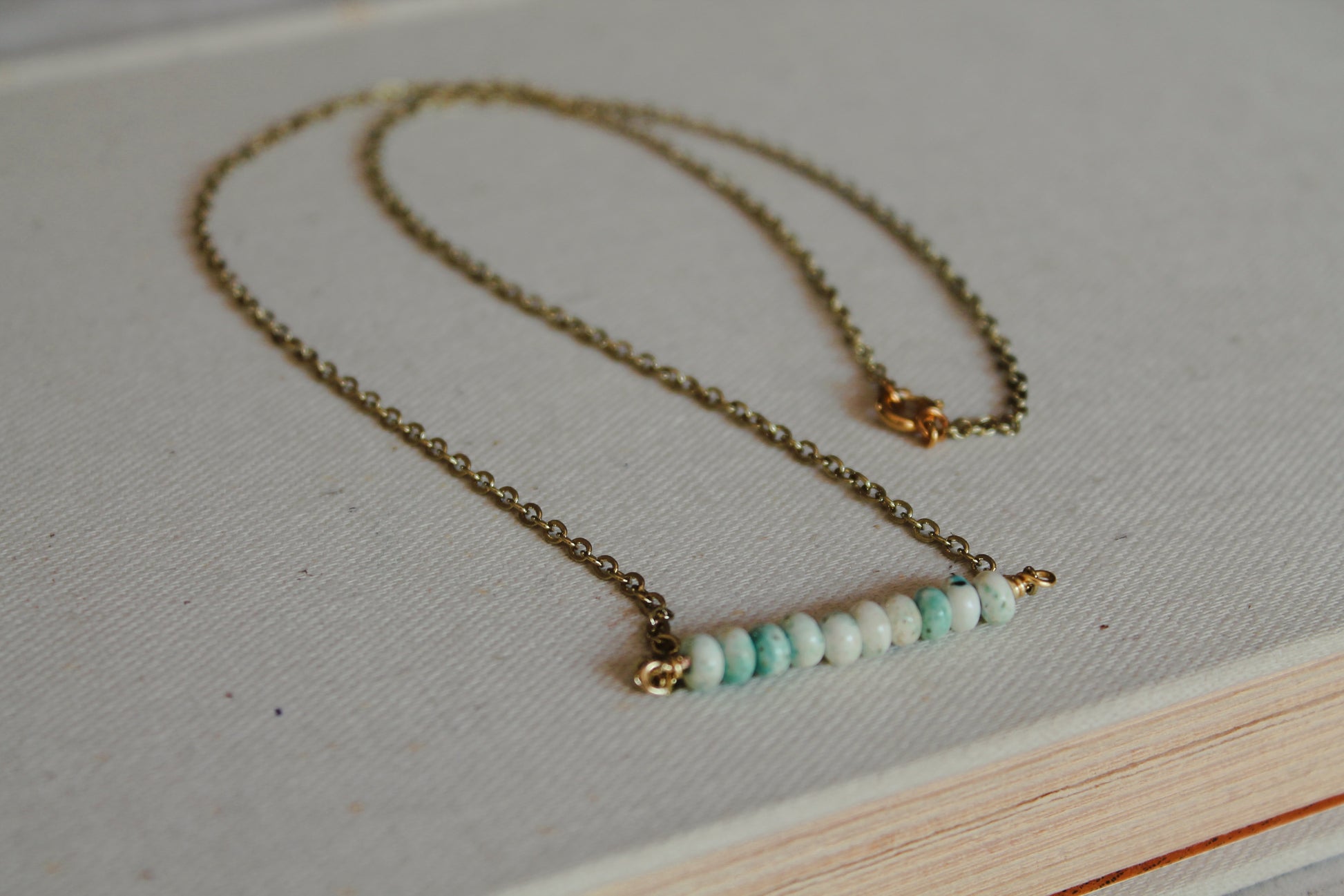 Featuring a lineup of beautiful stones, this necklace adds line and color to your look.